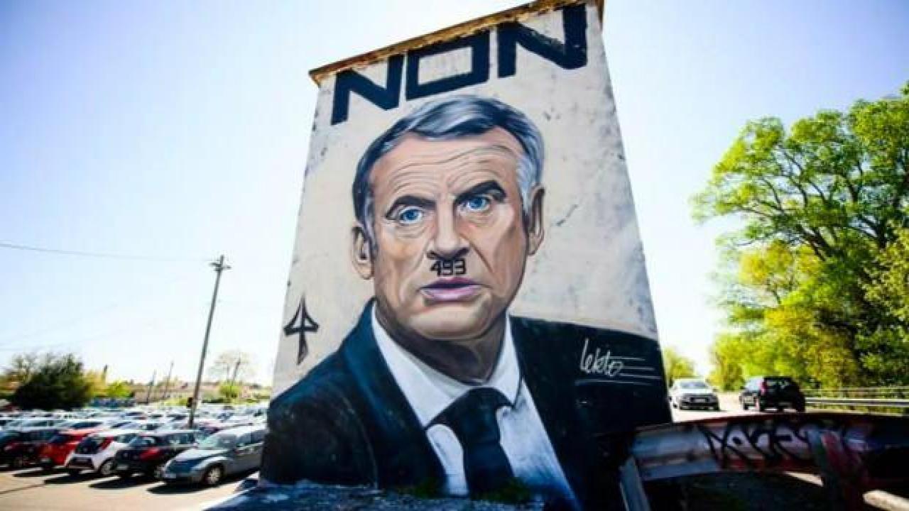 Macron'un yüzünün, "49.3" yazılı ve Hitler'inkine benzer bir bıyıkla resmedildiği grafiti gece beyaz boyayla kapatıldı. "49.3" yazısı, emeklilik reformunun mecliste oylamadan kabul edilmesi için hükümetin devreye koyduğu Anayasa'nın 49. maddesinin 3. fıkrasını anımsatıyor.