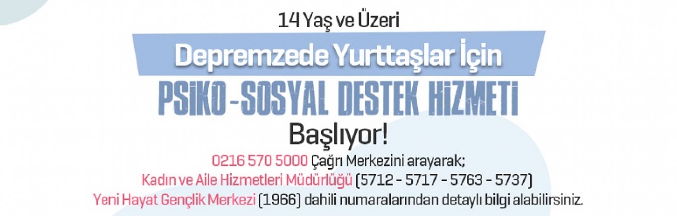 Ülkemizi derinden sarsan depremin toplum üzerinden oluşturduğu psikolojik travmanın etkilerini azaltmak adına desteğe ihtiyaç duyan 14 yaş ve üzeri yurttaşlar, Ataşehir Belediyesi'nin 0216 570 5000 Çağrı Merkezi'ni, Kadın ve Aile Hizmetleri Müdürlüğü'nün (5712 – 5717 5763 - 5737) ile Yeni Hayat Gençlik Merkezi'nin (1966) dahili numaralarından detaylı bilgi alarak randevu oluşturabilirler.