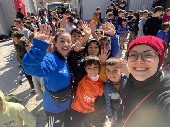 Ekipler Hatay’da depremzede çocuklarla eğlenceli oyunlar ve spor aktiviteleri yapıyor. Çeşitli noktalarda oluşturulan alanlarda dart oyunu, spor yarışması, çember atma, seksek ve benzeri oyunlarla çocuklar eğlendiriliyor. Oyun sırası için çocukların uzun kuyruklar oluşturduğu etkinliklerde çocuklar stres atıyor, motivasyonları yüksek tutulmaya çalışılıyor.