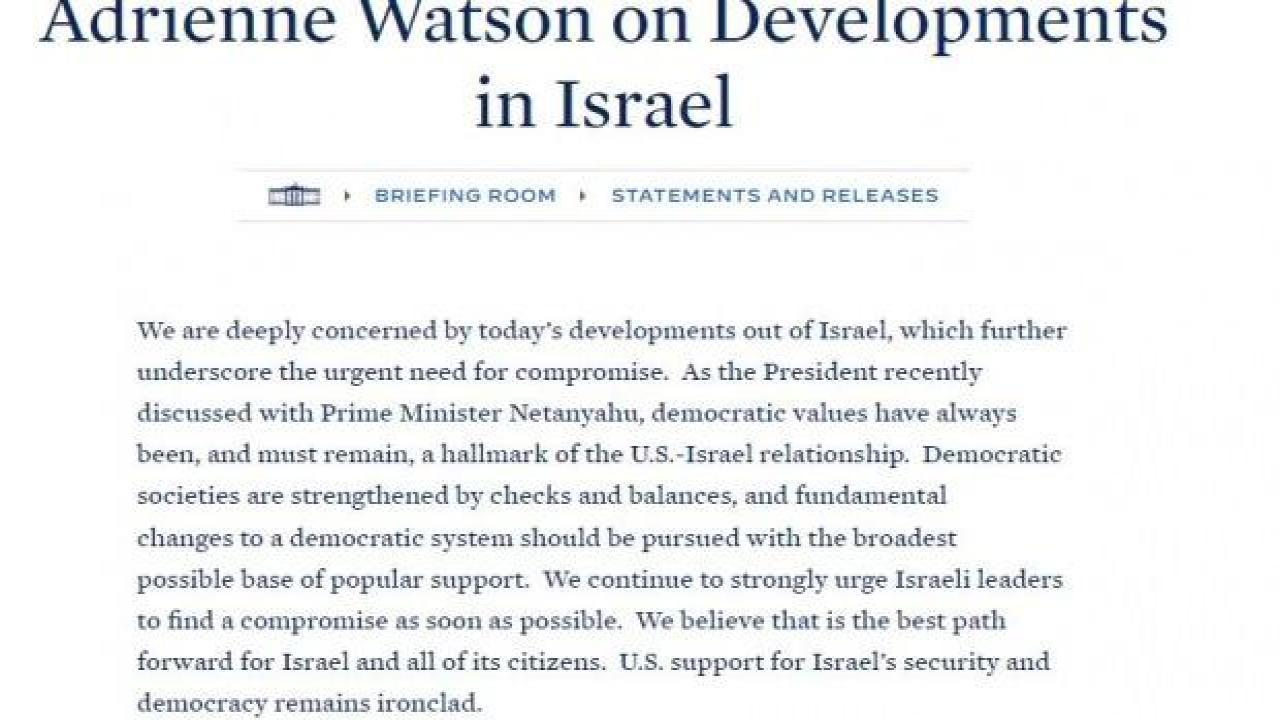 Beyaz Saray’da yayınlanan açıklamada, ABD Ulusal Güvenlik Konseyi Sözcüsü Watson, “İsrail’de yaşanan gelişmelerden derin endişe duyuyoruz ve acil uzlaşma ihtiyacının altını çiziyoruz. Başkanın yakın zamanda Başbakan Netanyahu ile yaptığı görüşmede belirttiği gibi demokratik değerler her zaman ABD-İsrail ilişkisinin ayırt edici özelliği olmuştur ve öyle kalmalıdır."