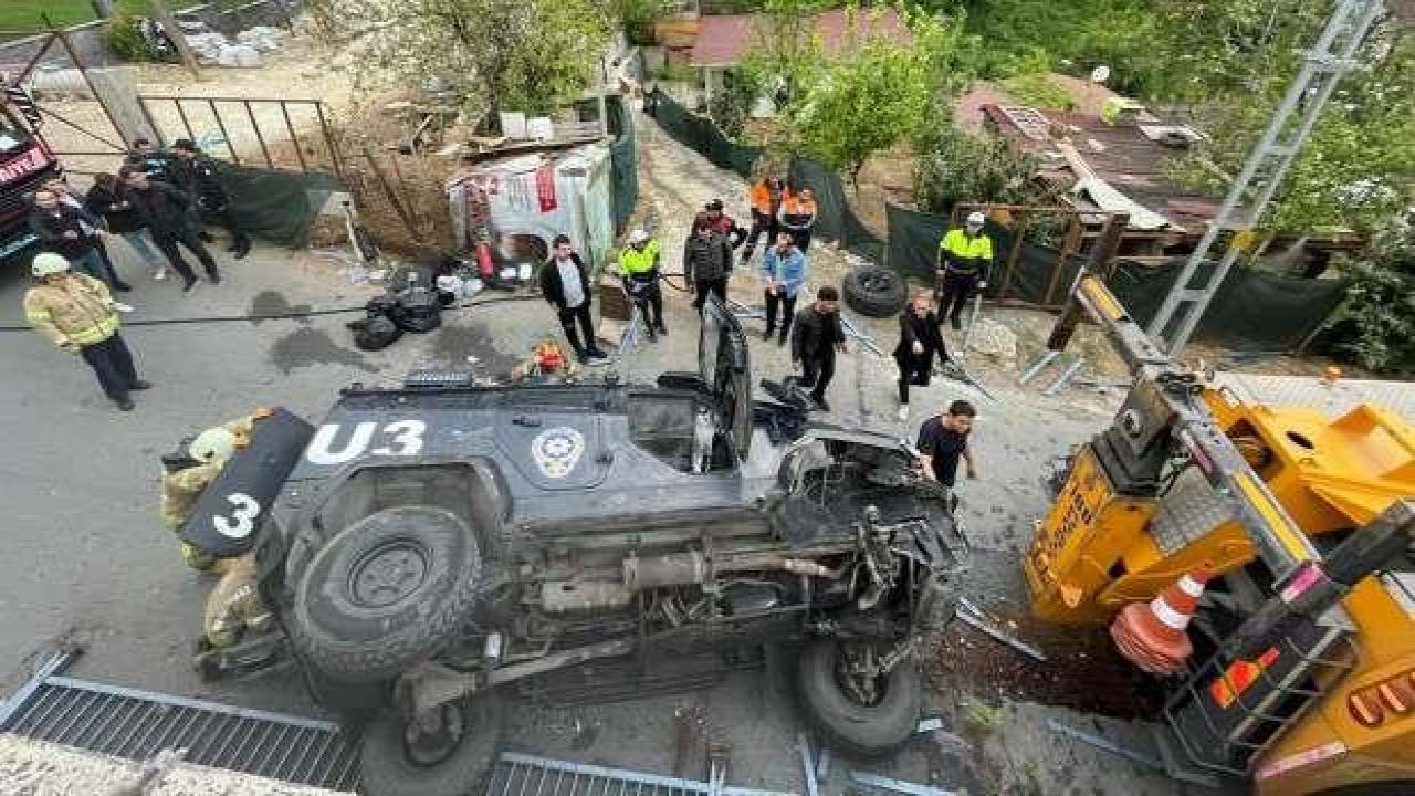 Alınan bilgiye göre, Sarıyer Caddesi'nde sürücüsünün direksiyon hakimiyetini kaybettiği polis aracı bariyerlere çarparak alt yola devrildi.