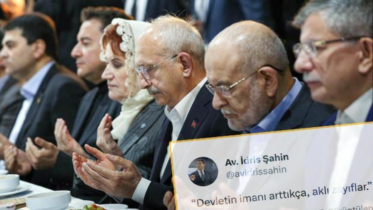 — Av. İdris Şahin (@avidrissahin) March 26, 2023 İyi Parti Genel Başkanı Meral Akşener’in “kumar masası” diyerek eleştirip 3 gün sonrasında geri döndüğü 6’lı koalisyon masası, din karşıtı söylemlerin odağında yer almaya devam ediyor.